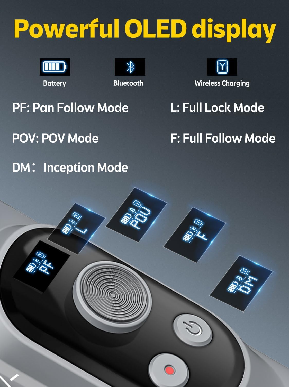 - OLED screen shows mode, battery level, Bluetooth status