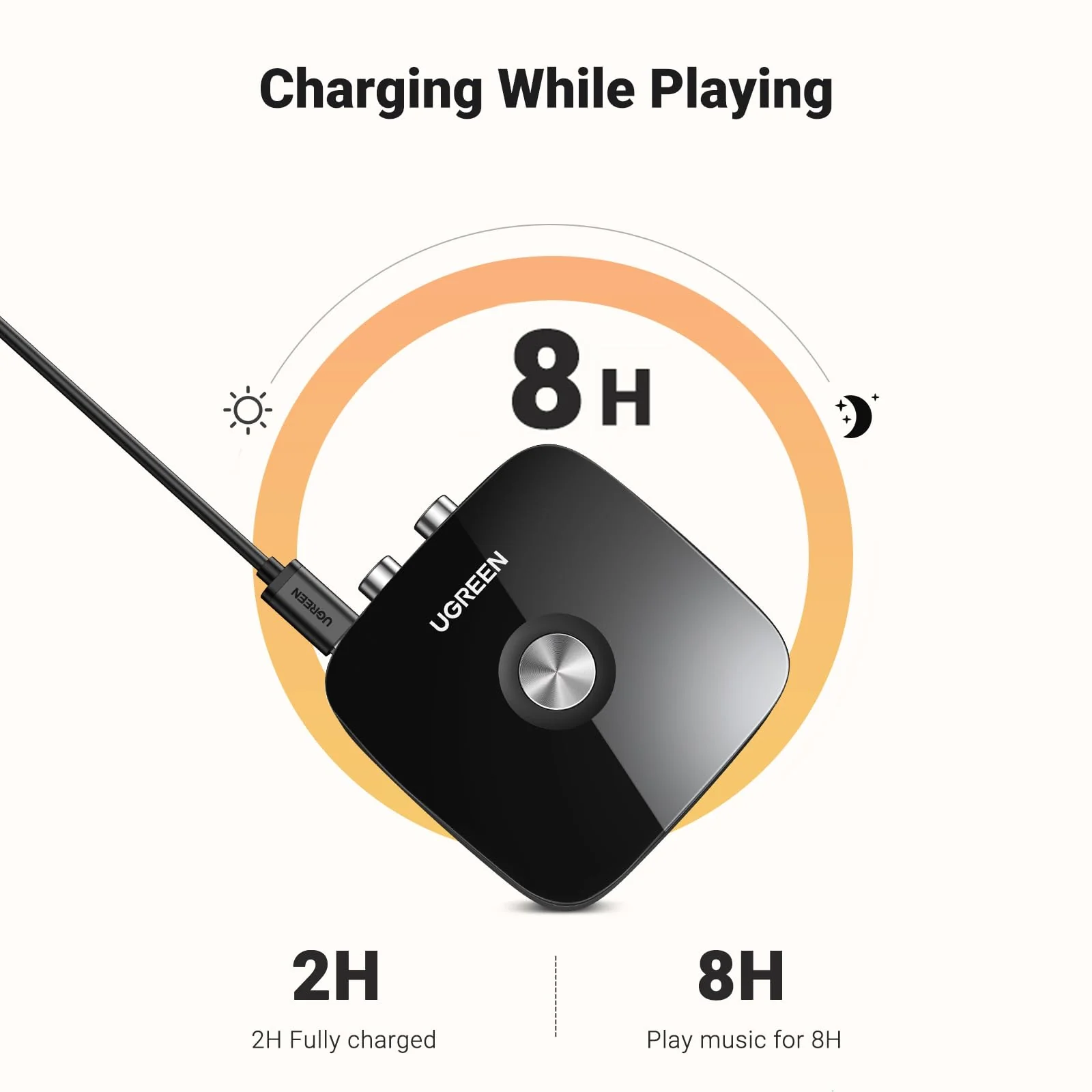 The UGREEN CM123 is a compact Bluetooth audio receiver designed to add wireless Bluetooth functionality to existing wired audio systems. With 3.5mm and RCA audio output support, it allows you to stream music wirelessly from smartphones, tablets, and computers to home audio systems, speakers, or wired headphones.